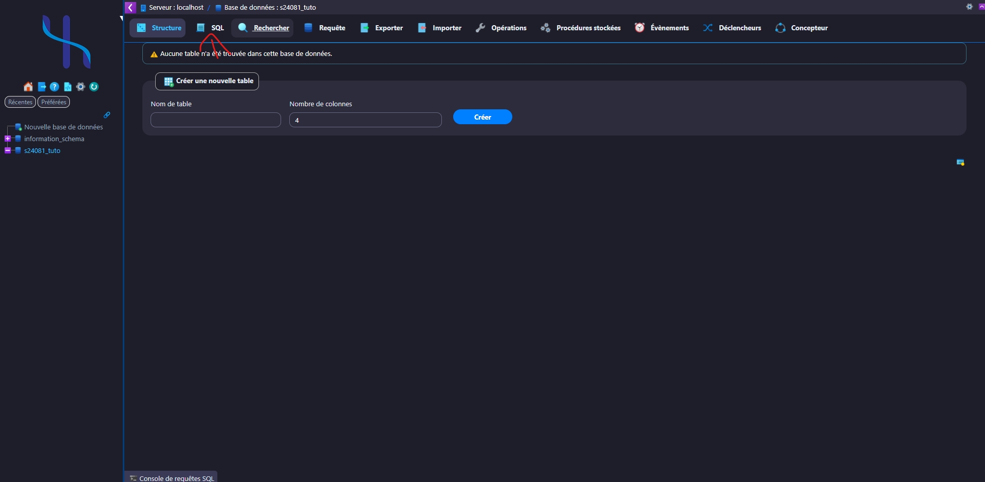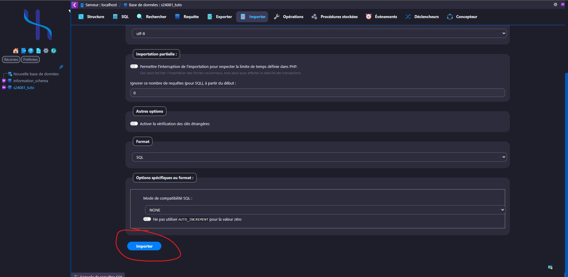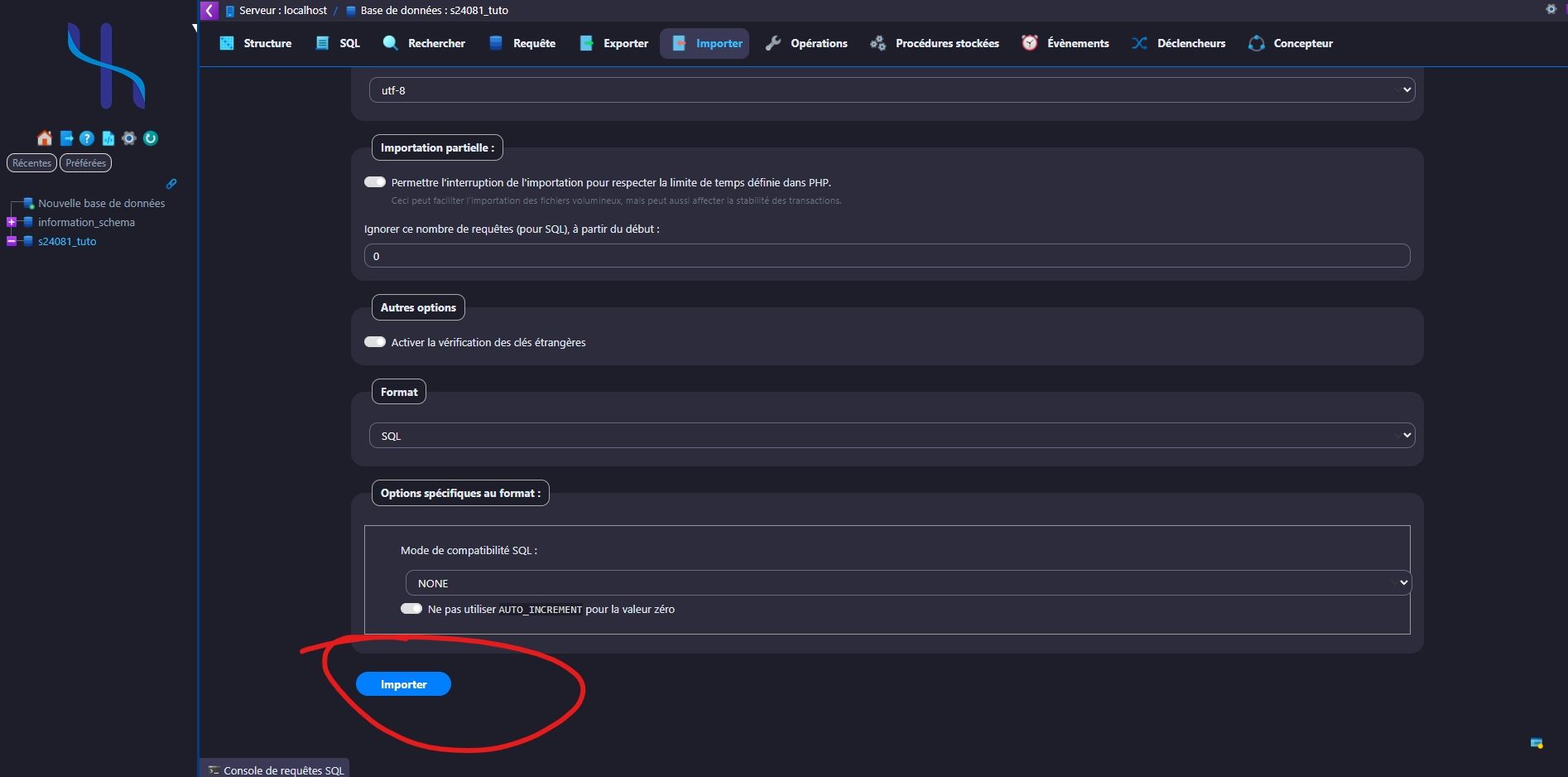 Sur le PhpMyAdmin sélectionner à droite de structure, SQL puis ouvrez votre fichier .sql et copier l'intégralité du fichier (CTRL + A et CTRL + C)