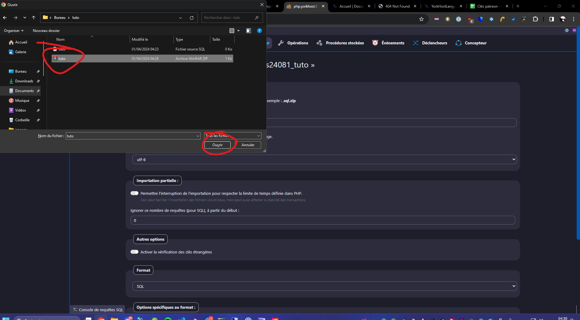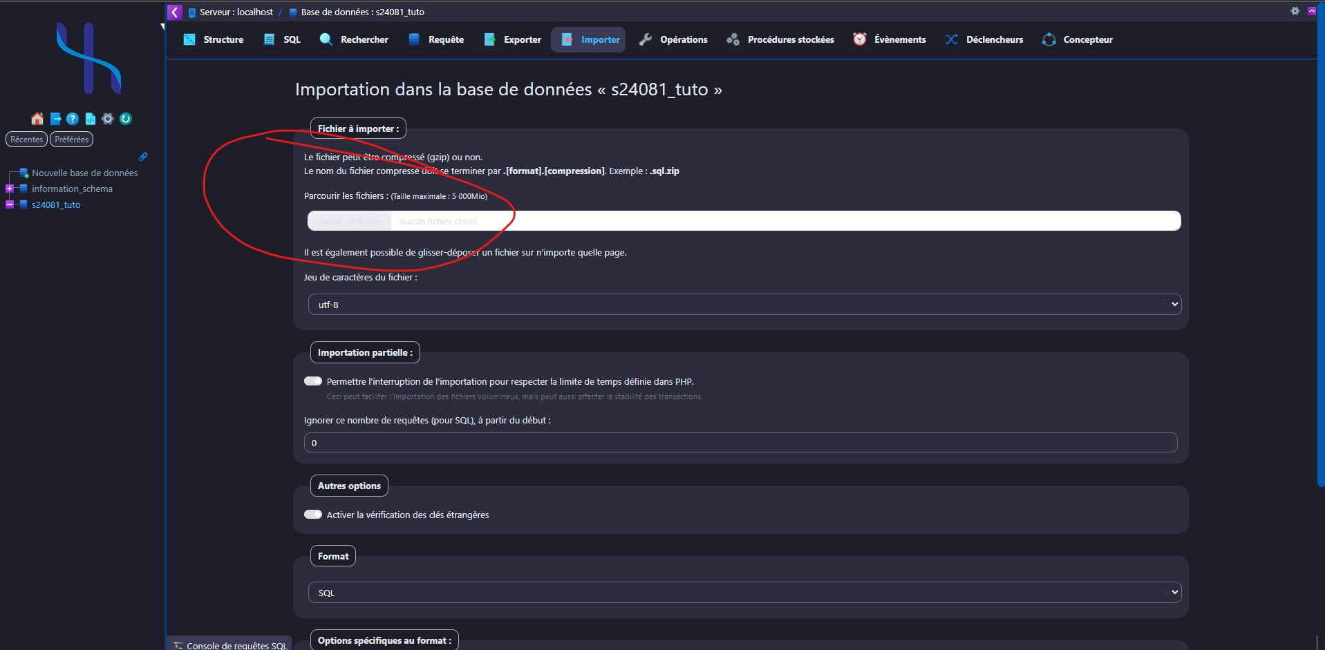 Une fois sur cette page, il y a deux possibilité, soit vous cliquer dans Choisir un fichier Aucun Fichier Choisi et vous mettez votre fichier .sql soit vous le compresser en .zip.