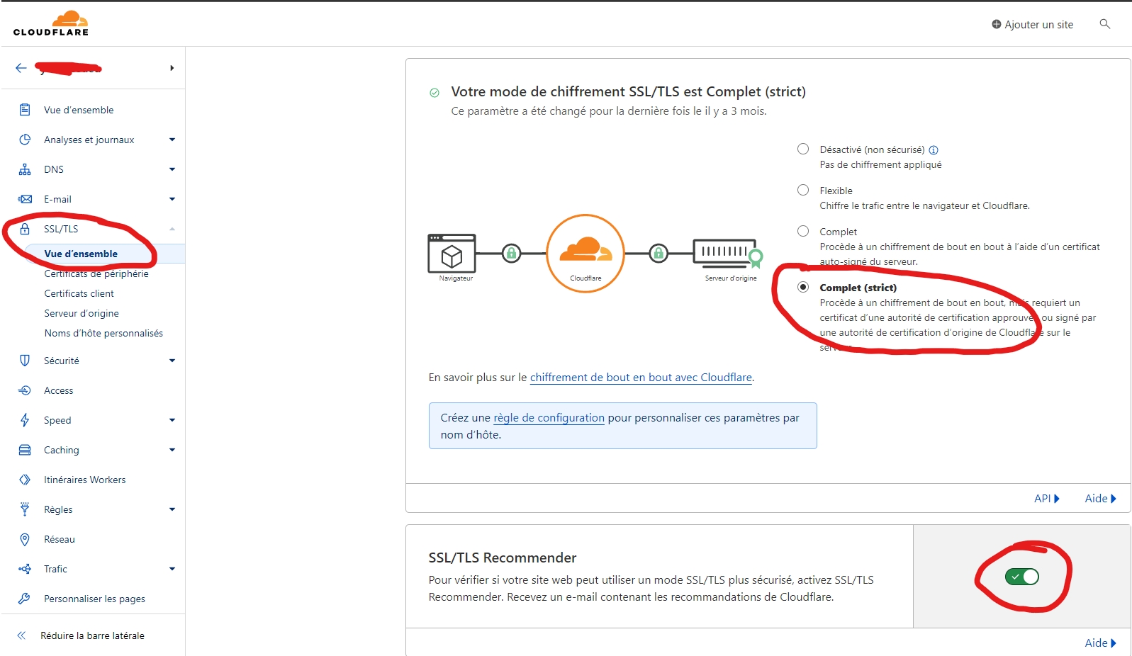 Recommended Cloudflare SSL Settings:SSL/TLS Mode: Go to theSSL/TLSsection in Cloudflare and set the mode toFull (strict).Always Use HTTPS: In the “Edge Certificates” tab, enable“Always Use HTTPS”.Automatic HTTPS Rewrites: Still in “Edge Certificates”, enable“Automatic HTTPS Rewrites”.Proxy status(orange cloud ☁️):Once your SSL certificate is installed on Plesk, you canre-enable the Cloudflare proxy(orange cloud) on your A / AAAA records.This hides your server IP and keeps your site protected via Cloudflare.