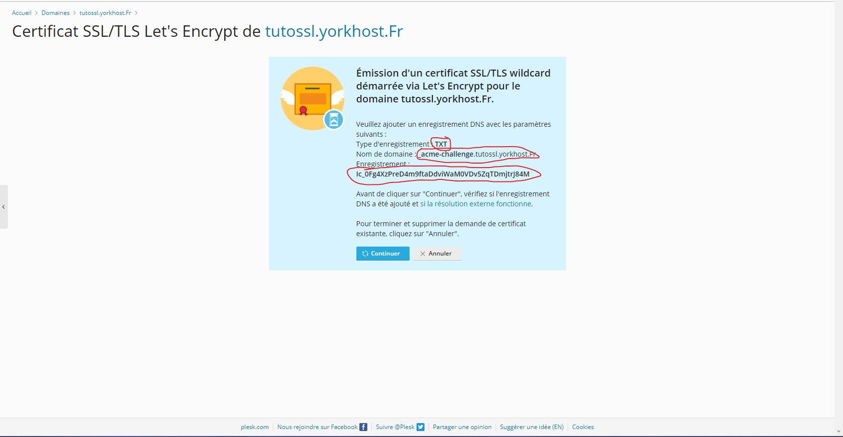 (the value provided by Plesk, usually something like _acme-challenge.yourdomain.com) ![]()